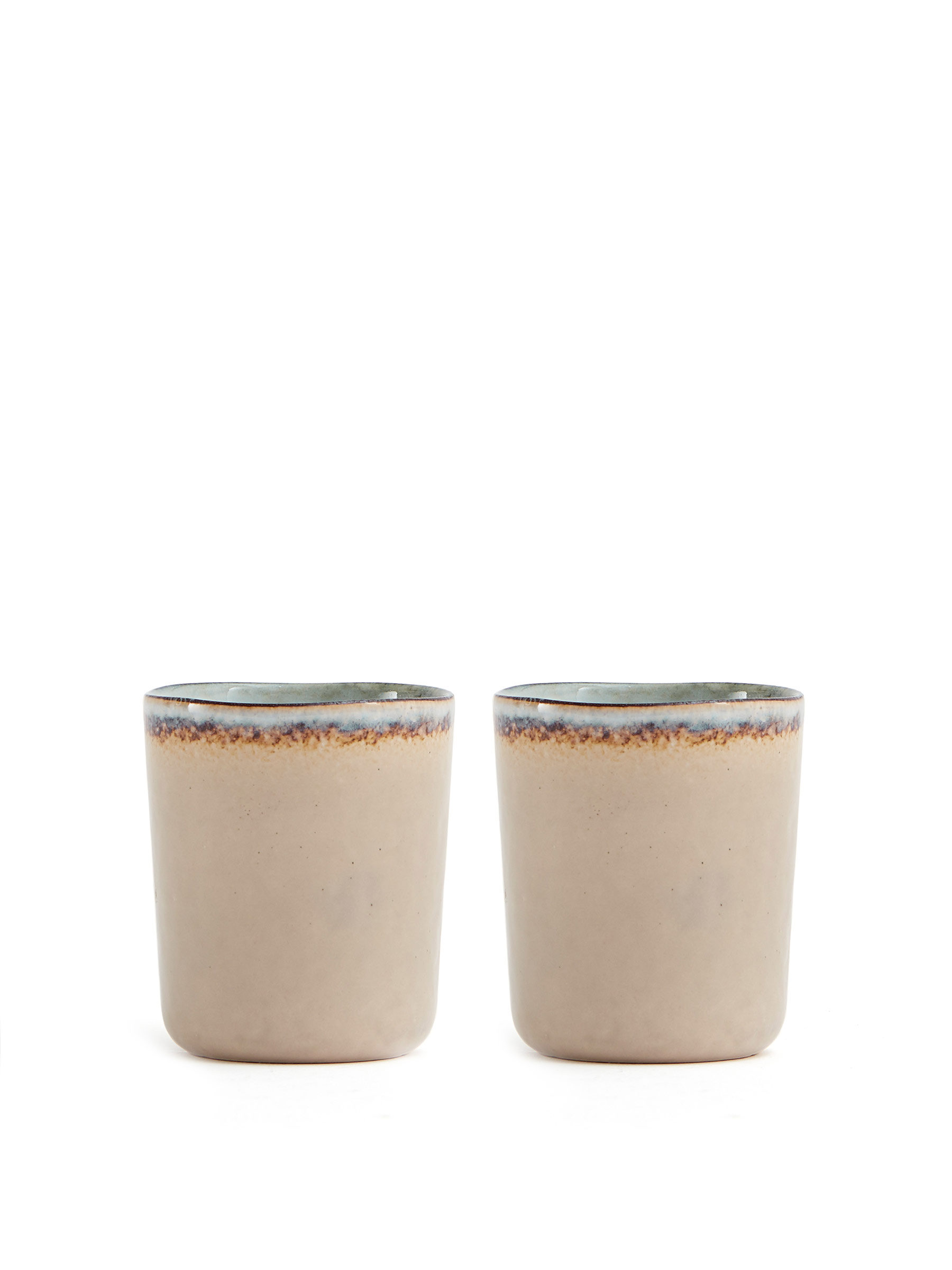 Två stycken muggar utan öra i stengods. Japanskt möter skandinaviskt, rustikt möter modernt. Nomimono har sin källa i naturen och jorden runt om oss, vilket gett inspiration till denna rustika serie i naturnära, jordiga toner där inget objekt är det andra likt. Varje produkt är skapat i handgjort stengods som glaserats tre gånger för rätt finish. Det gör varje produkt unik, vilket också är en stor del av Nomimonos charm. Samlarobjekt för en jordnära och inspirerande servering. Diskmaskin-och mikrovågsugn säkra.
