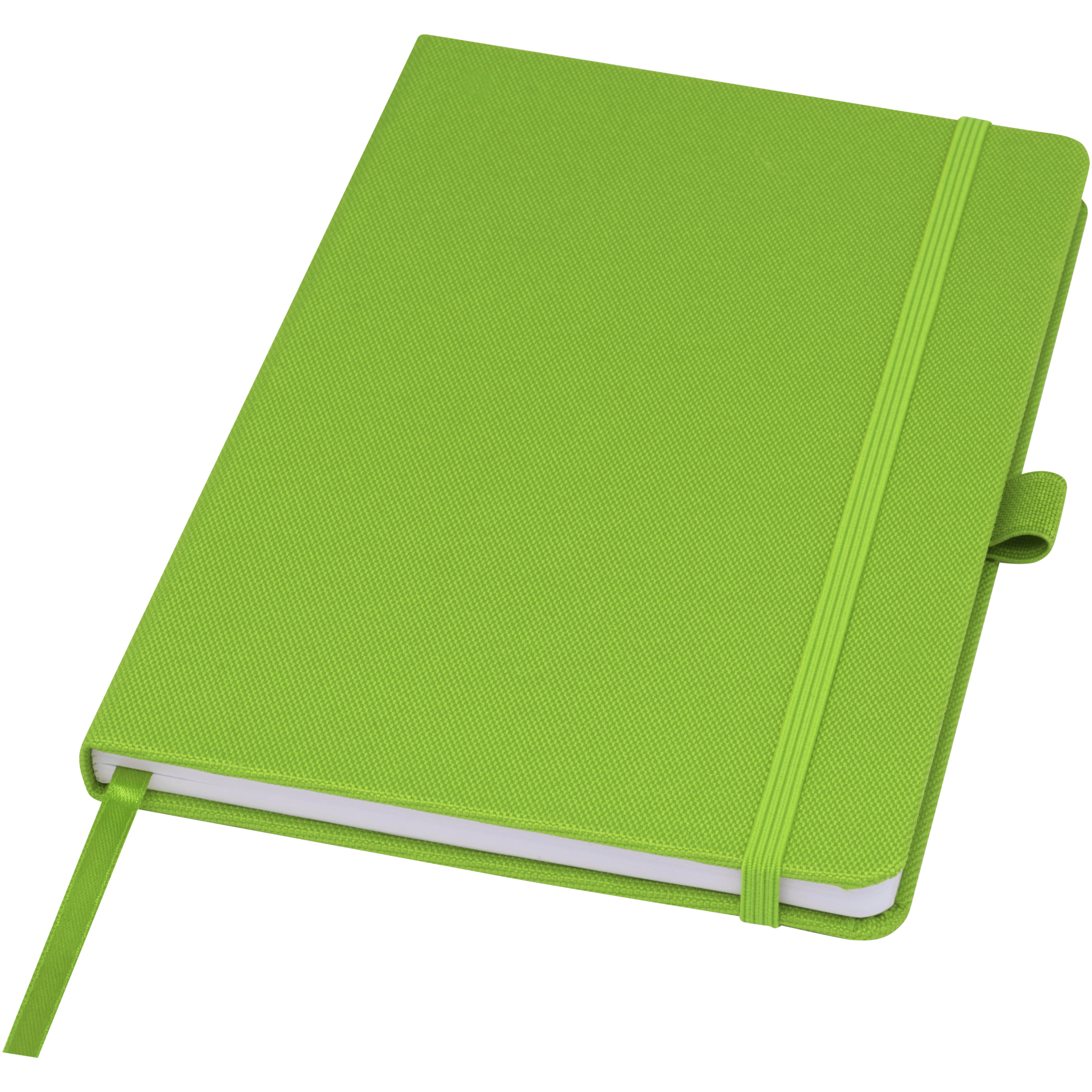 A5 anteckningsbok med cover av RPET tyg. Innehåller 80 ark 70 g/m² återvunnet papper med fodrad layout, en pennslinga och bandmarkör. Kan kombineras med 107757 Honua RPET kulspetspenna.