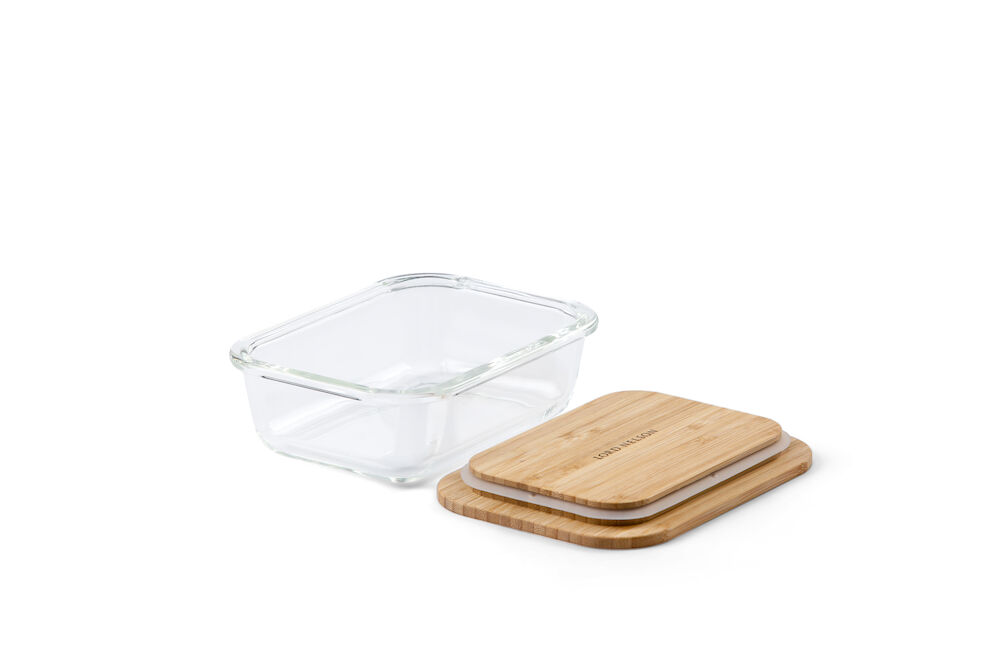 Matlådor i glas har många fördelar för miljön men även för dig som gillar att förbereda mat. Trälocket är gjort av bambu och har en gummilist som gör att den återförsluts med lätthet. Förpackningarna är stapelbara, kan användas i micro, ugn eller i kylskåp, dessutom tål den att maskindiskas. På locket finns stor yta för profilering.
