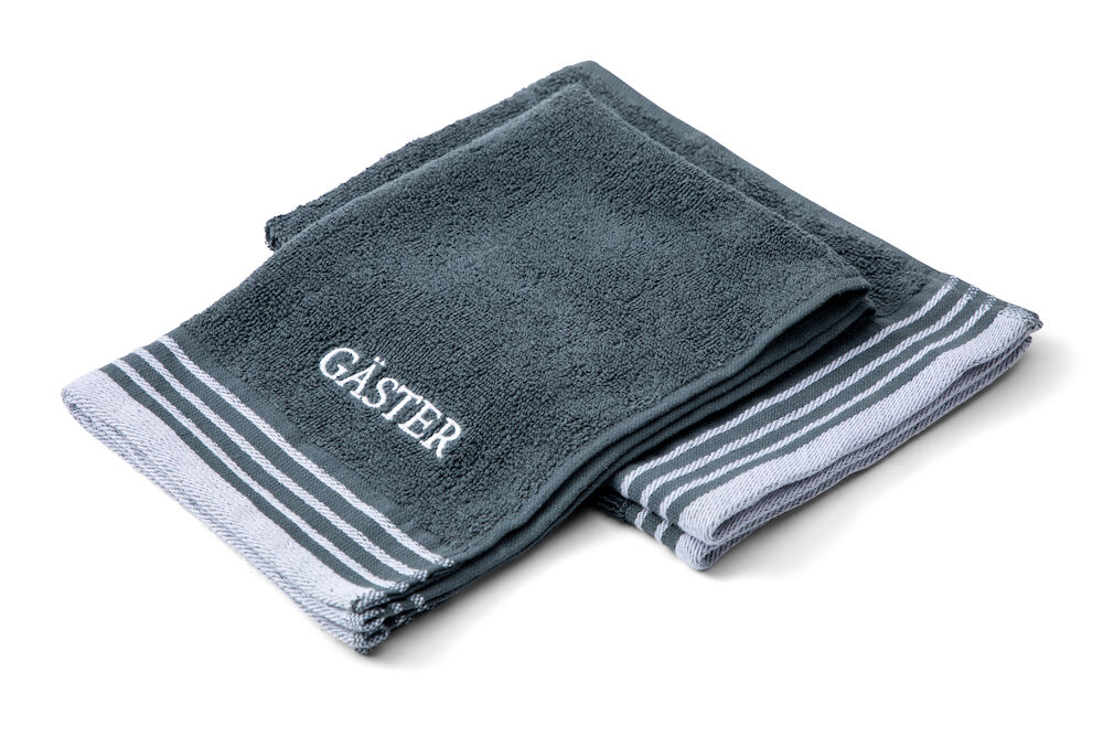 Välkomna dina gäster med fina och mjuka gästhanddukar. De är gjorda av högabsorberande bomull och gör att dina gäster får en mjuk upplevelse. Den kommer i 2-pack med banderoll och har en fin brodyr "Gäster" nere på kortsidan. Handduken har god uppsugningsförmåga.