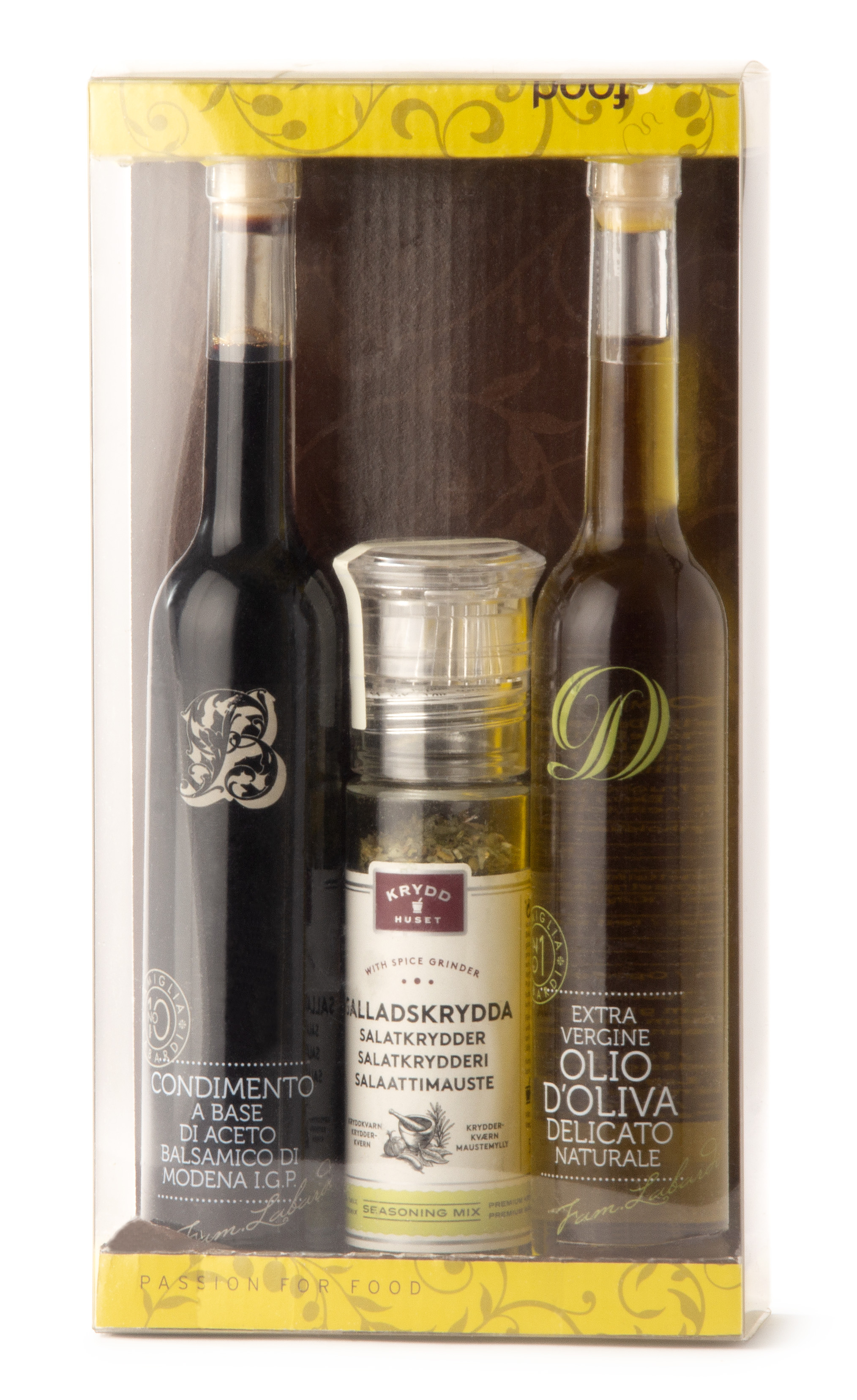 Innehåller en kryddkvarn med salladskrydda och olivolja och balsamico.