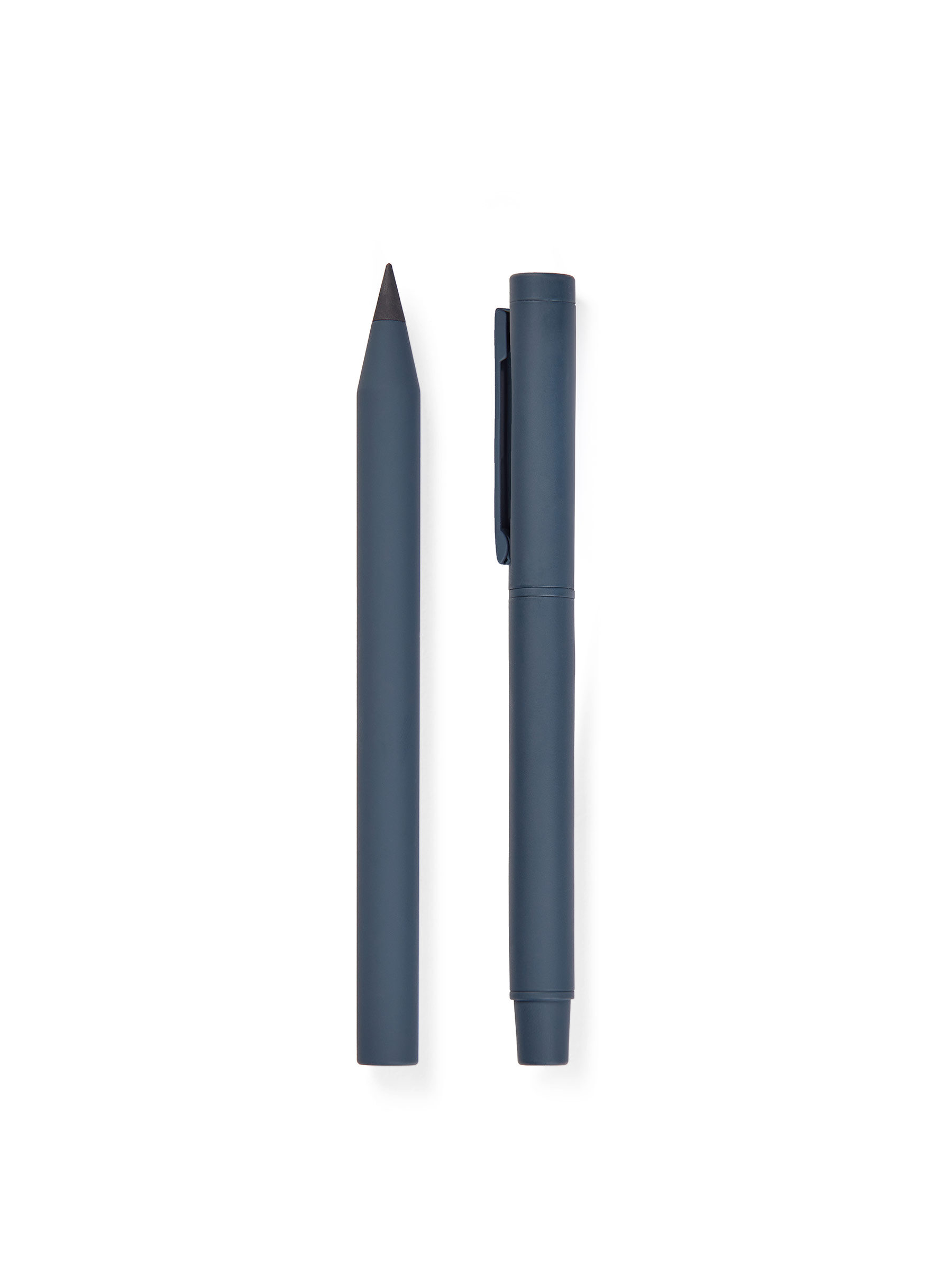 Detta moderna och stilrena set innehåller två pennor: en evighetspenna och en klassisk kulspetspenna med lock och klämma. Båda pennorna är designade med stil och funktionalitet i åtanke, tillverkade av RCS-certifierat återvunnet rostfritt stål och försedda med en gummiyta för ett bekvämt grepp och en matt finish. Med en balanserad vikt ligger de skönt i handen och gör skrivandet bekvämt och stabilt. Evighetspennan erbjuder obegränsat skrivande, medan kulspetspennan har en spets på 1,00 mm och ger en jämn och konsekvent skrift med dokumentblått bläck som räcker upp till 1200 meter. Certifierad enligt RCS (Recycled Claim Standard), RCS-certifieringen garanterar att hela leveranskedjan av återvunna material är certifierad. Det totala återvunna innehållet baseras på produktens totala vikt. Denna produkt innehåller 52 % RCS-certifierat återvunnet aluminium och 10 % RCS-certifierat rostfritt stål.