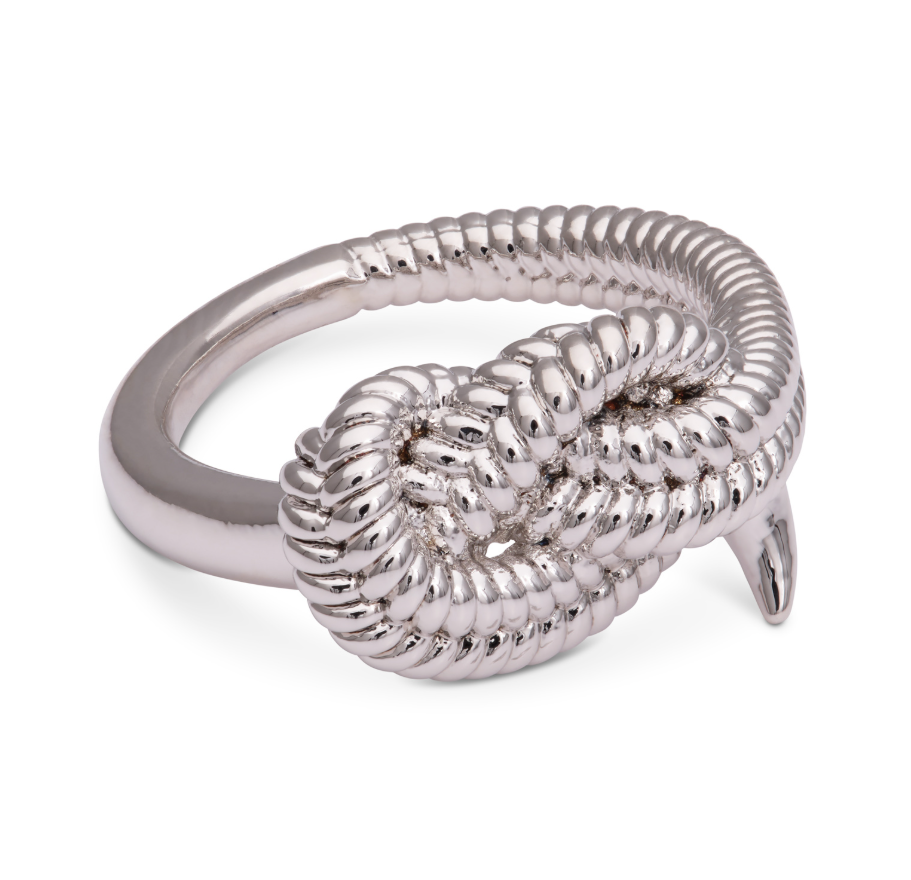 Denna rodiumpläterade ring är förkroppsligandet av en konstnärlig själ. Genom motivet av en reptvinnad knut skapade vi denna unika ring. Alla YLVA LI-smycken är handgjorda av våra mycket skickliga och erfarna hantverksjuvelerare.