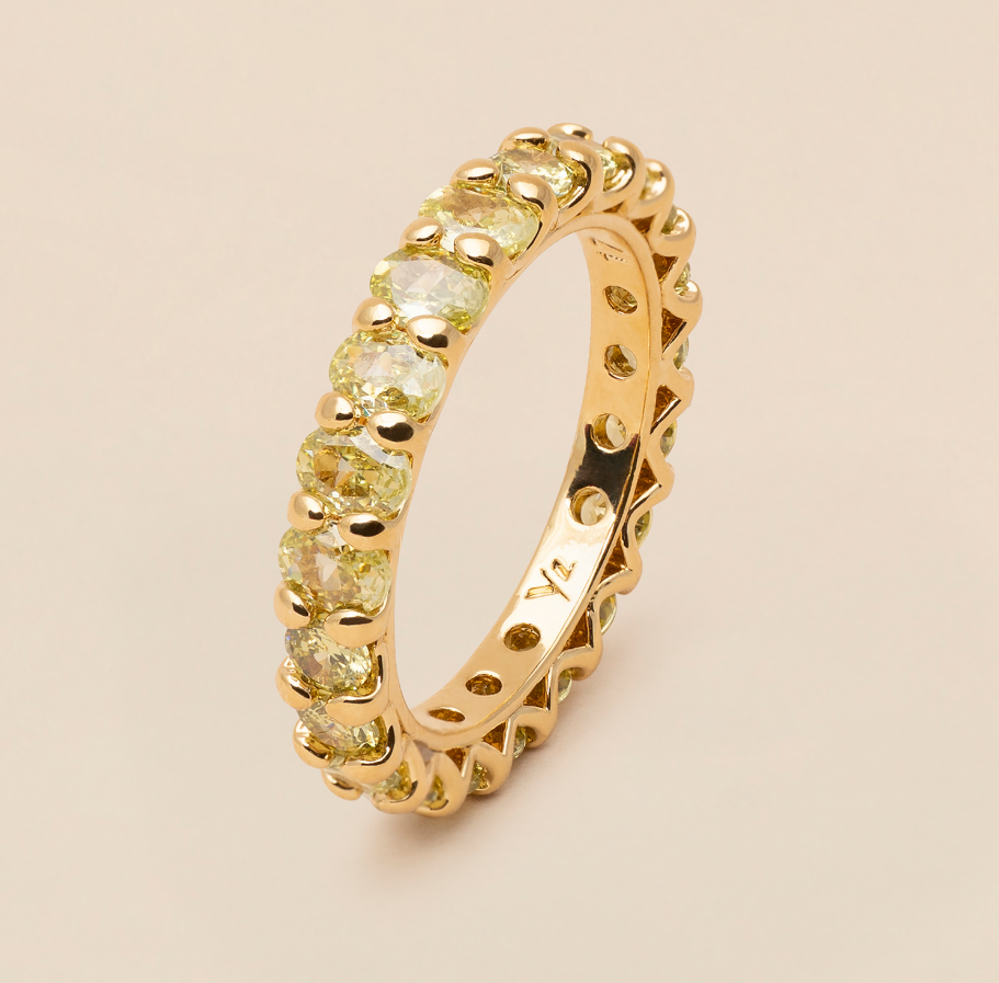 Denna klassiska tennisring kan bäras som ett statement-pjäs eller kombineras med andra ringar för extra glans. Guldfärgade klor ger ytterligare utsmyckning, samtidigt som de säkert omsluter en kombination av peridotfärgade prinsesslipade ovala stenar och runda kristaller, vilket säkerställer att denna tidlösa accessoar hjälper dig genom oändliga dagar av äventyr och nätter av extravagans.
