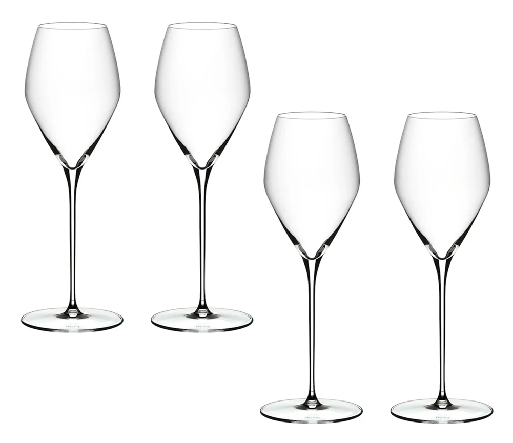 Riedels serie Veloce har fått sitt namn från italienskans ord för snabb. De vackra vinglasen utmärker sig med en kupa i tunn kristall och en smal, hög stam. Den eleganta känslan förstärks av att kuporna har en diamantformad design. Precis som Riedels andra glasserier är Veloce-glasen druvspecifika. På foten av varje glas finns en märkning som säger vilken druva kupan passar till.