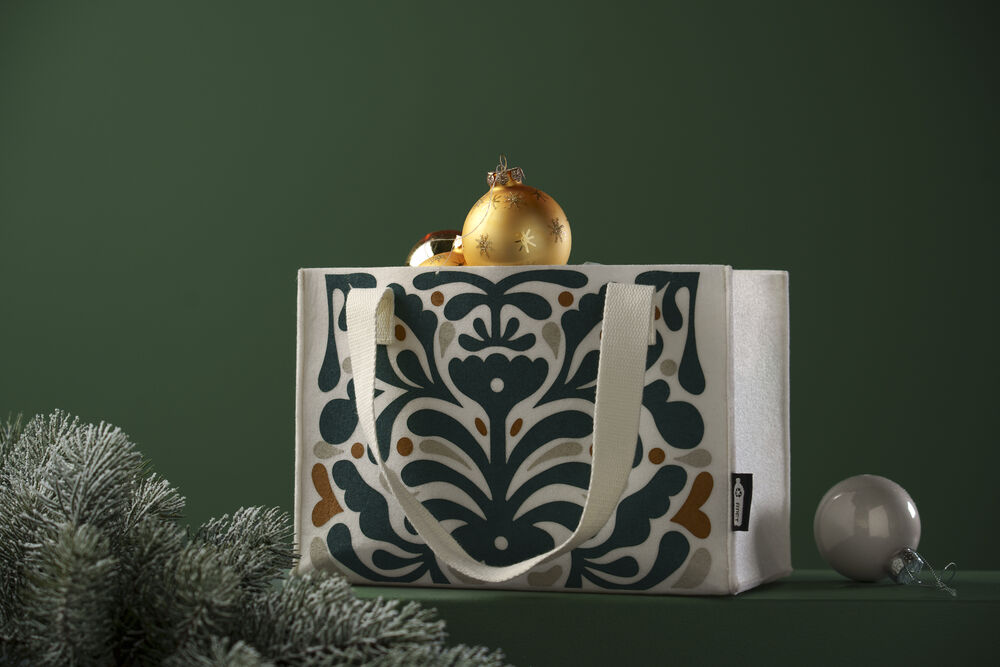 Mindre väska i mjukt filttyg gjort utav 100% R-PET. Väskan är lätt och behänding och rymmer en lunchlåda eller gå-bort presenter. Efter användning kan den vikas ihop smidigt. Mått: 25x17x13 cm