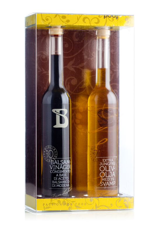 Trevlig presentlåda innehållandes olivolja och balsamvinäger från Italien: