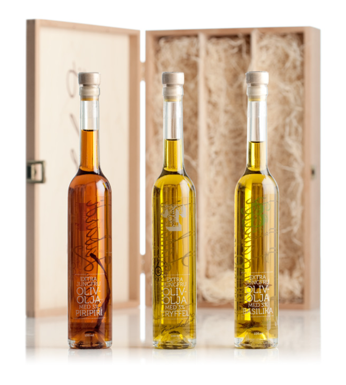 Trälåda i naturträ med träull innhållandes tre italienska olivoljor med härliga smaker: