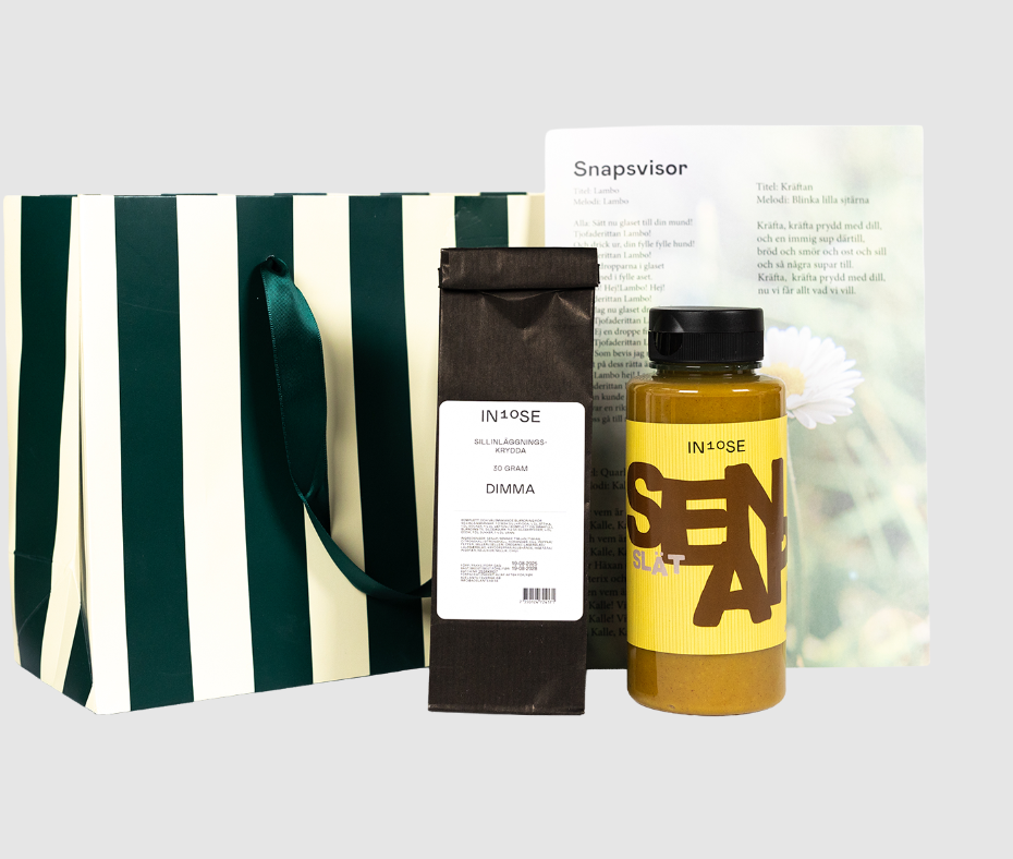 1st Påse i grön/vit randig design och gröna satin band 1st Påse med sill inläggsningskrydda till att göra egen sill 30 g 1st Sötstark slät senap 265 ml 1st Blad med snapsvisor