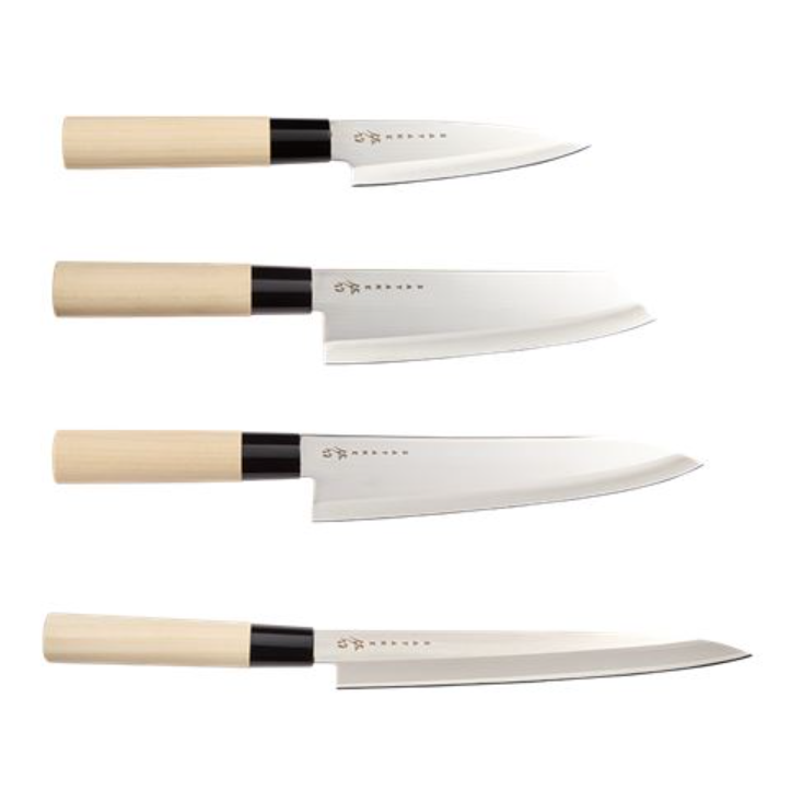 Knivsetet innehåller: en 12 cm Petty/skalkniv, en 17 cm bunka/kockkniv, en 21 cm Gyuto/kockkniv & en 21 cm Sashimikniv.