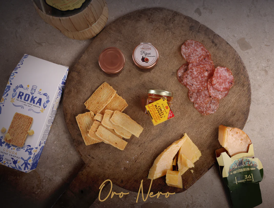 I centrum står en smakrik lagrad Old Rotterdam-ost med tydlig sälta och kristalliserad textur. Den serveras tillsammans med ROKA:s krispiga ostkex bakade med äkta gouda, och en handgjord fikonmarmelad från Frankrike som lyfter både ost och chark.