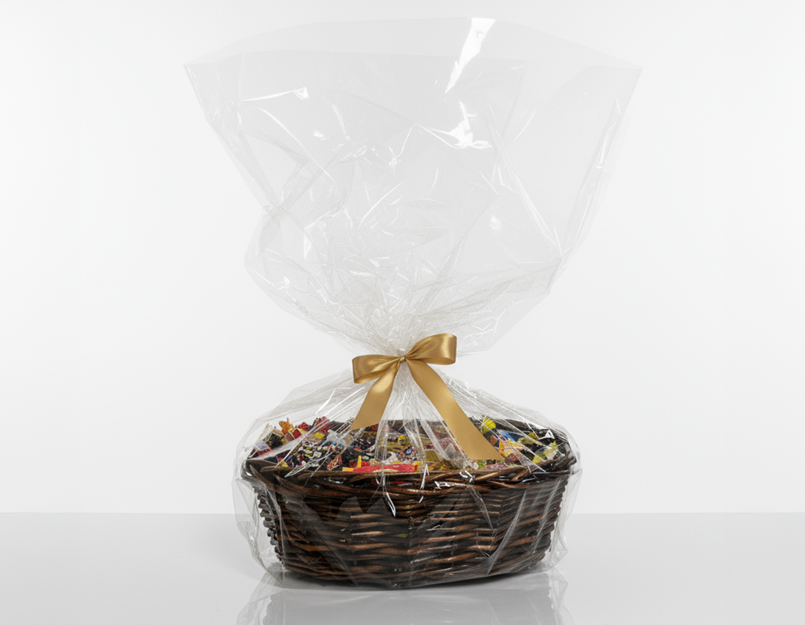 En generös och vackert flätad korg fylld med 3.5 kilo blandat godis – den perfekta presenten till kollegor, kunder eller någon du vill skämma bort! Korgen är elegant inslagen i cellofan och dekorerad med ett satinband vars färg varierar efter säsong och högtid, vilket gör varje korg unik.