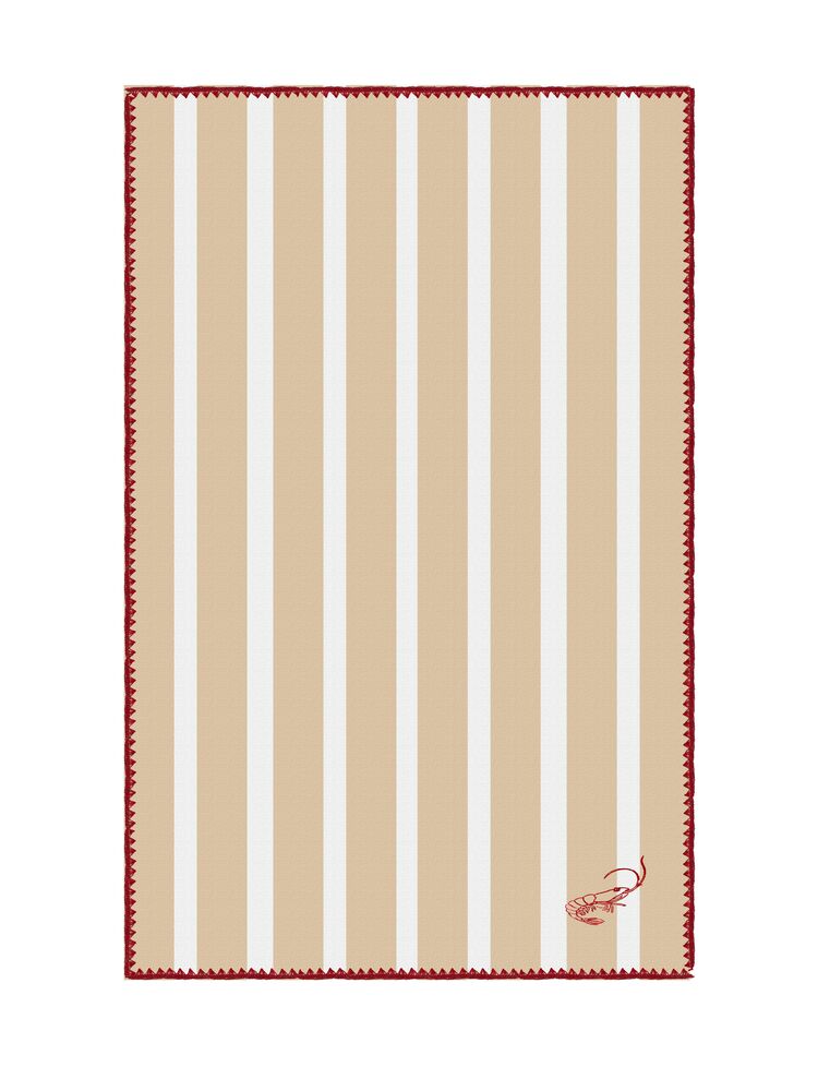 Bubba bordsduk för tankarna till Sydeuropa och långa, inbjudande middagar. Med klassiska ränder i beige och vitt, en laskad kant med röd kontrast och en broderad räka för en lekfull touch, blir denna duk ett charmigt inslag på bordet. Matcha med servetter och kökshanddukar i samma serie för en enhetlig och elegant dukning. Tillverkad i 70% återvunnen bomull och 30% återvunnen polyester. Mått: 150x280 cm. Levereras med ett band och rosett. Design Byon Studio.