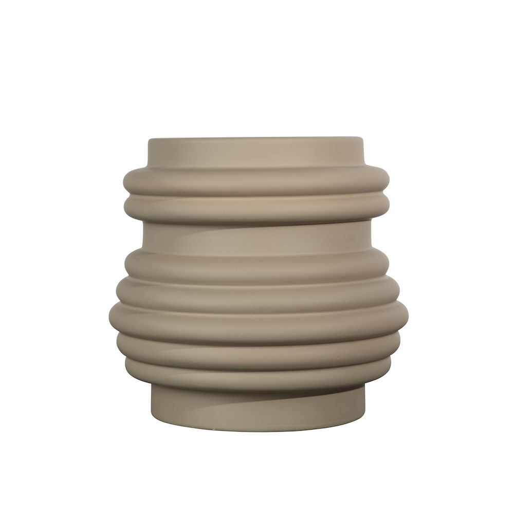 Skulpturell och tidlös beige kruka i stengods med gummerad yta som ger både ett fint intryck samt skön känsla att ta på.