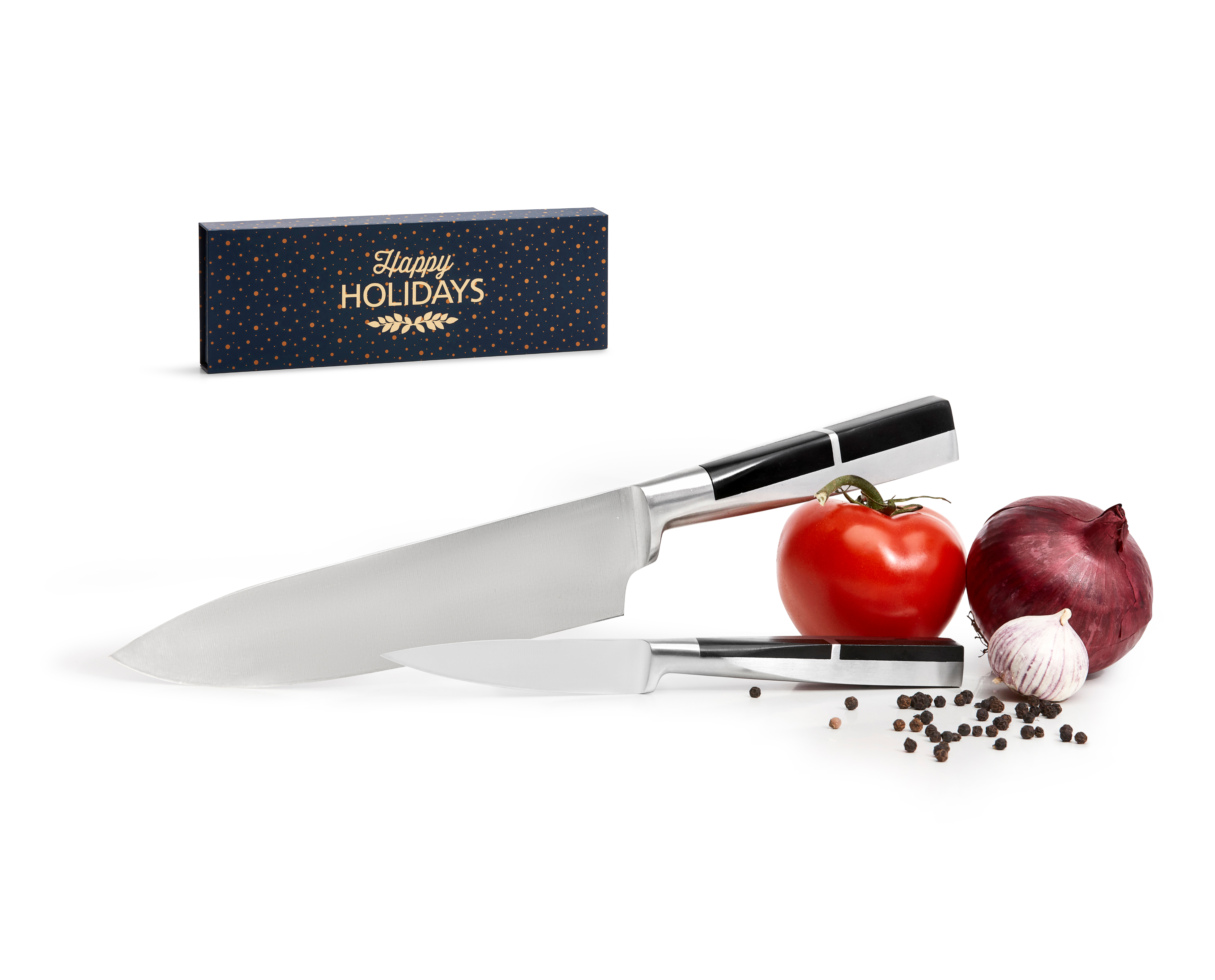 Välarbetat knivset med handtag i en häftig kombination av rostfritt och svart. En kockkniv och en grönsakskniv snyggt packat tillsammans i en läcker presentkartong med formskuren bädd. Perfekt gåva!, Rostfritt stål., 0,274kg Mått: 395 x 375 x 305 mm