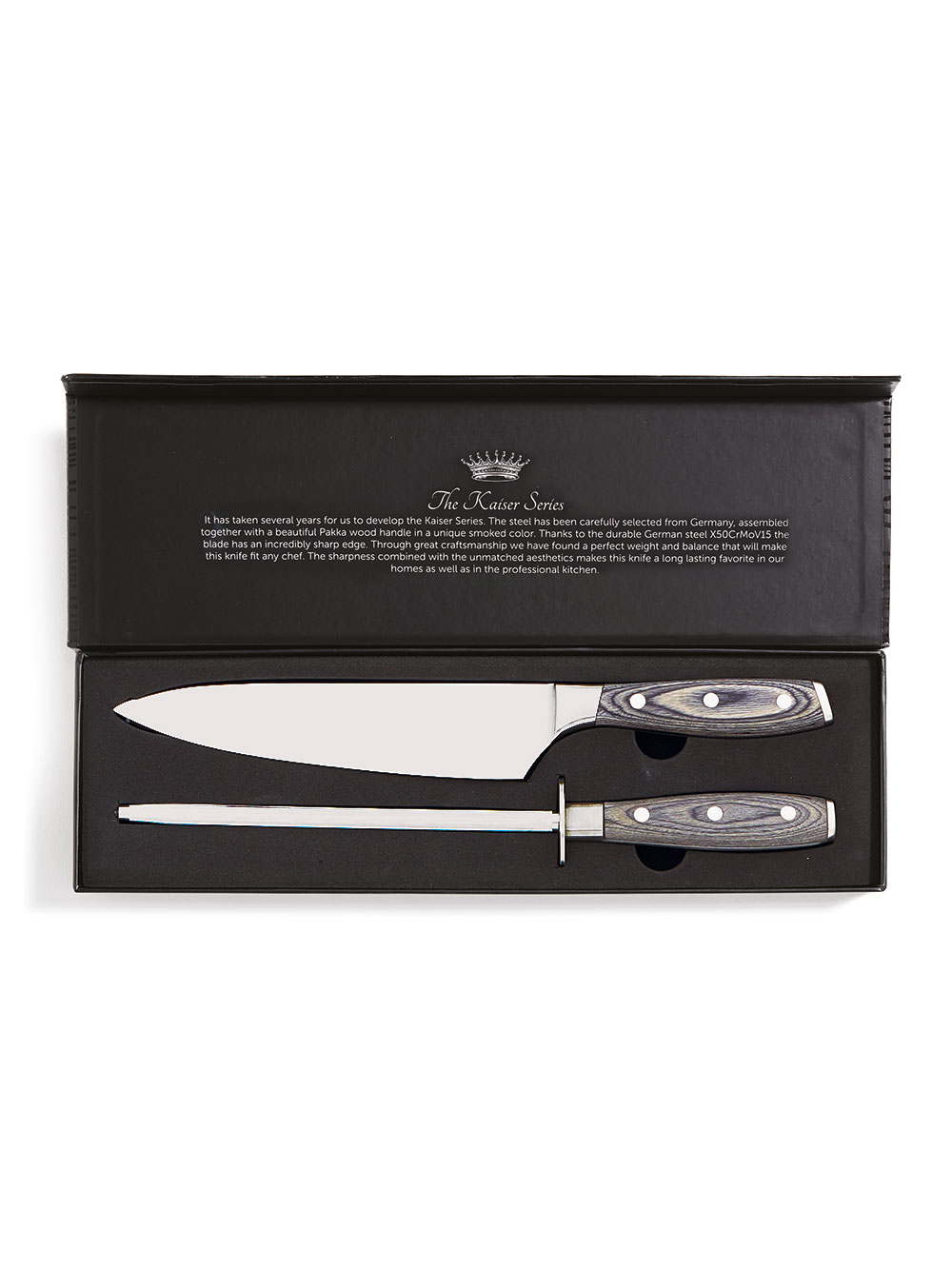 Kockkniv och brynstål ur Kaiser-serien. Kniven är tillverkad av tyskt stål, X50CrMoV15, och handtaget är av pakkaträ. Handtaget är greppvänligt vilket tillsammans med den välbalanserade kroppen från ände till egg gör den skönare och lättare att arbeta med. Det tyska stålets goda egenskaper gör att kniven både blir fläckbeständig och inte heller ställer höga krav på skötsel mer än bryning då och då.