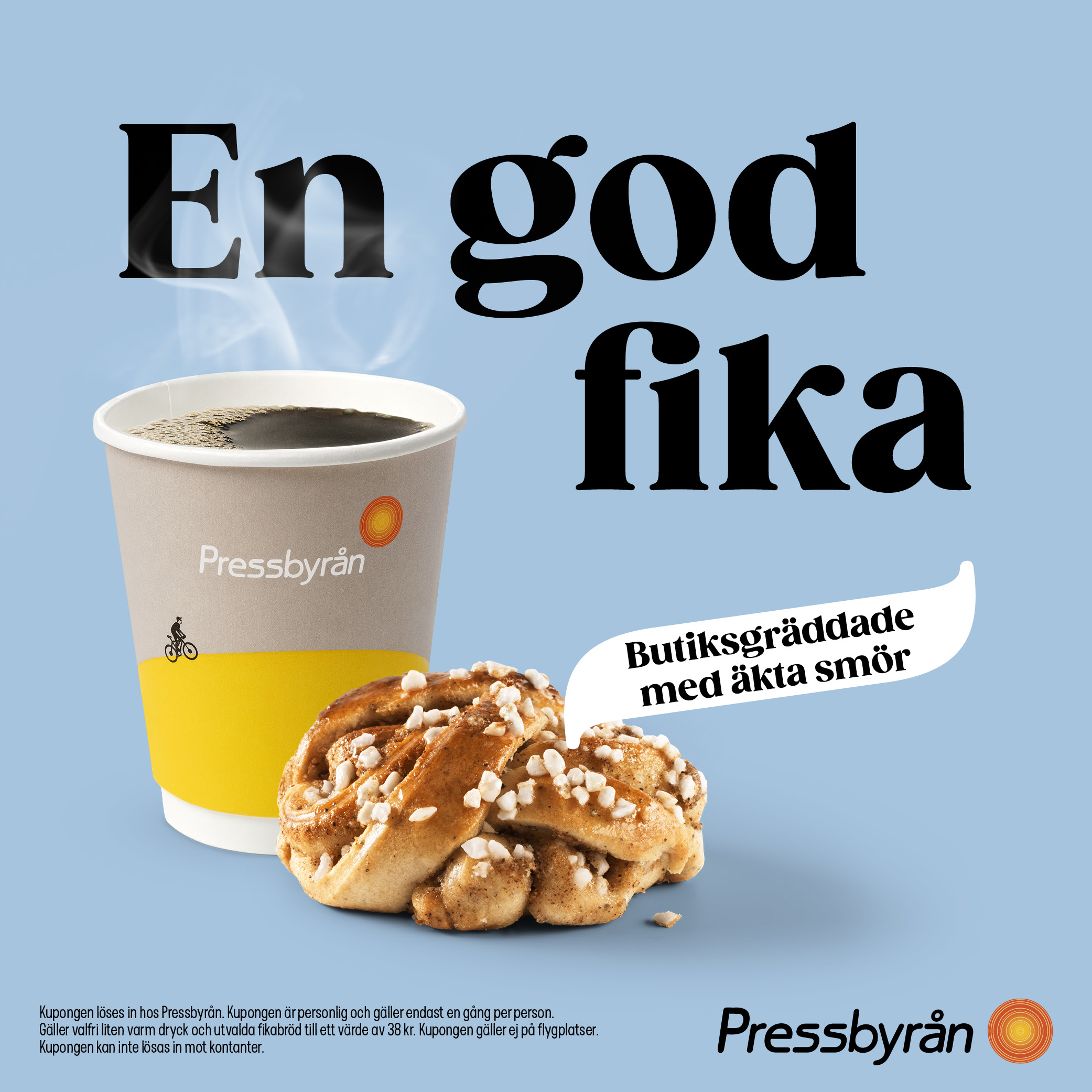 Kupongen löses in hos Pressbyrån. Kupongen är personlig och gäller endast en gång per person. Gäller valfri liten varm dryck och valfritt ordinarie fikabröd till ett värde av 36 kr. Gäller ej fikabröd märkta med stjärna. Kupongen kan inte lösas in mot kontanter.